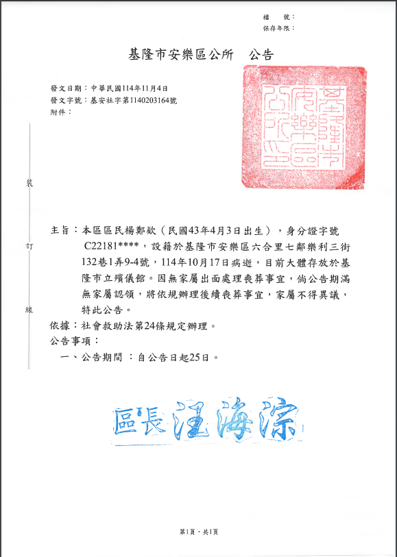 基隆市安樂區公所區民楊○欵君死亡公告