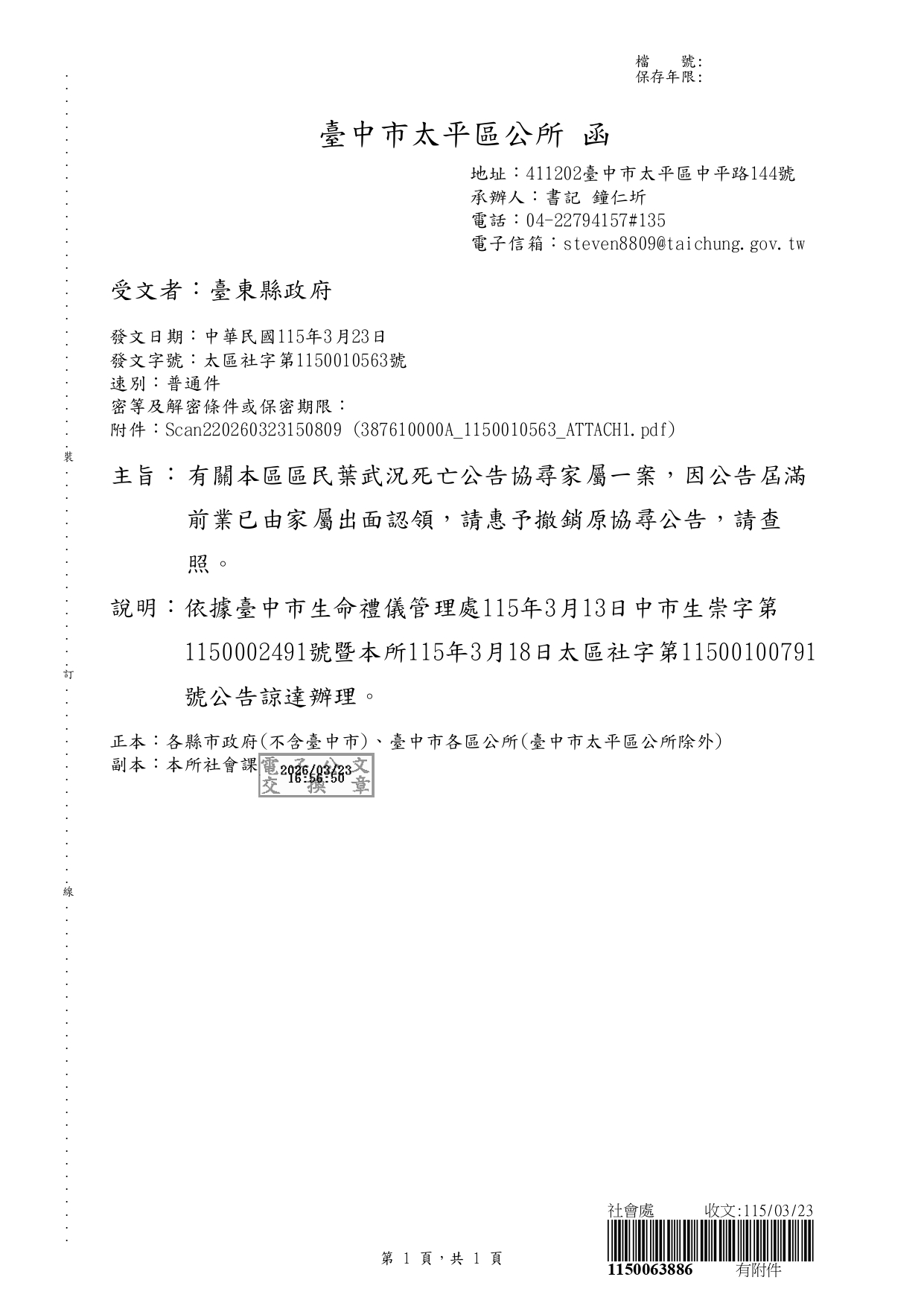 函轉臺中市太平區公所函發撤銷死亡公告1份
