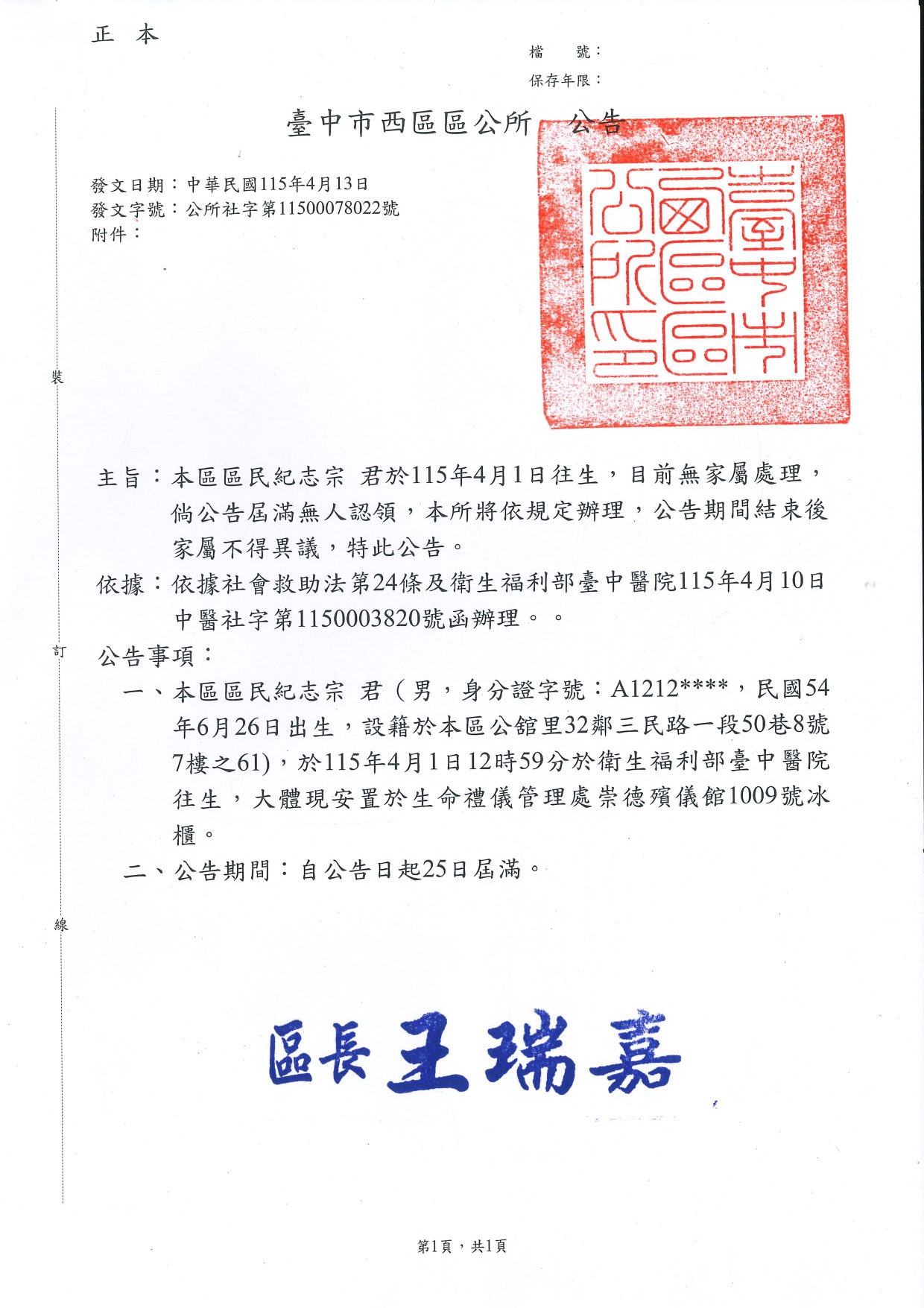 函轉3縣市函發死亡公告4份-26.04.15