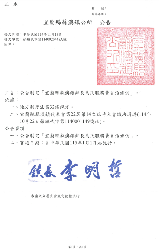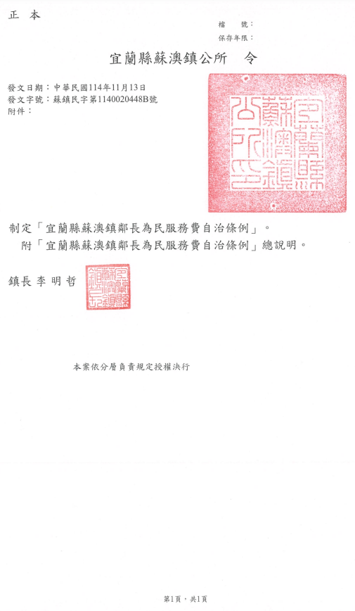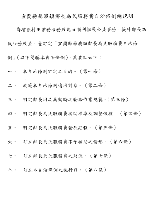 檢送宜蘭縣蘇澳鎮公所「宜蘭縣蘇澳鎮鄰長為民服務費自治條例」公告、發布令、條文及總說明各1份
