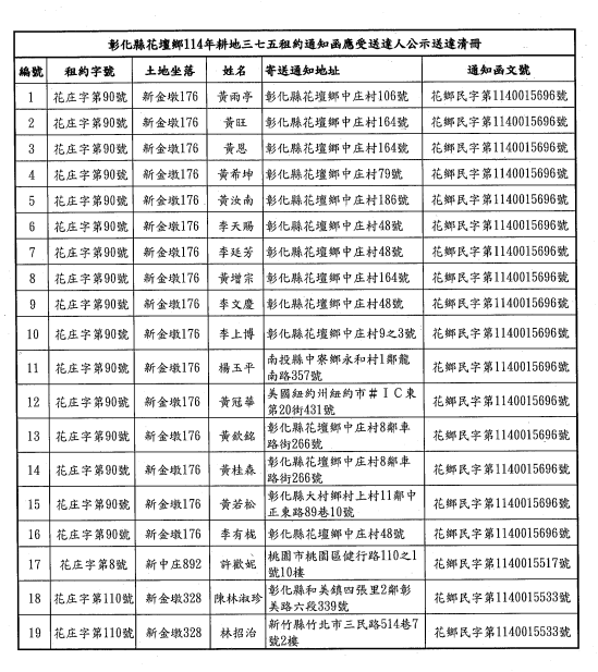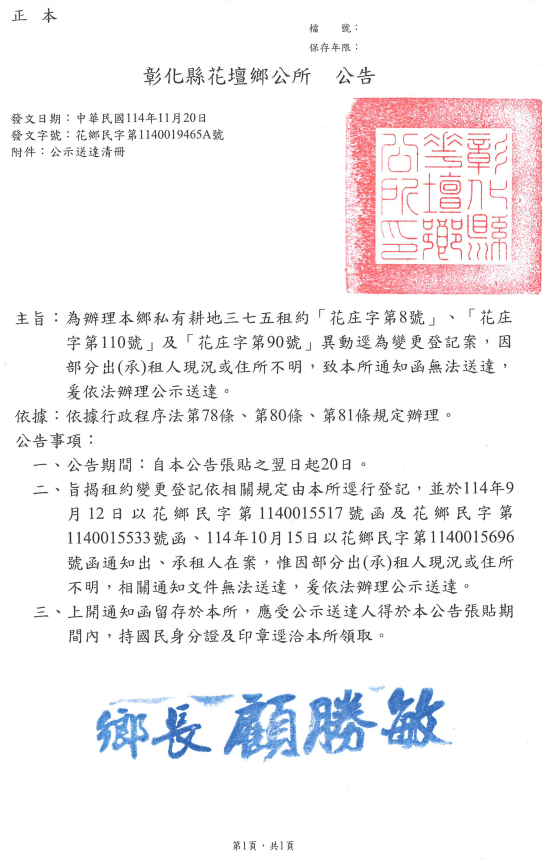 檢送彰化縣花壇鄉公所辦理本鄉私有耕地三七五租約「花庄字第8號」、「花庄字第90號」及「花庄字第110號」異動逕為變更登記案,因部分出(承)租人現況或住所不明,致本所通知函無法送達,爰依法辦理公示送達 上一篇 下一篇