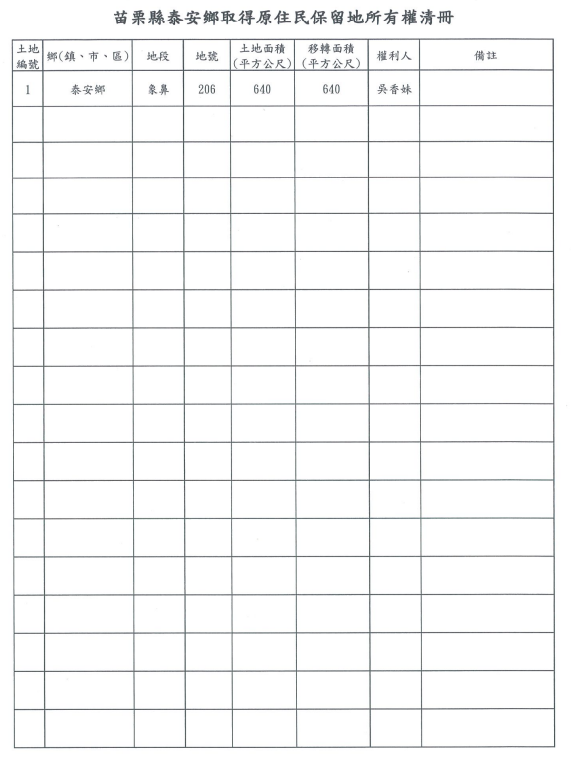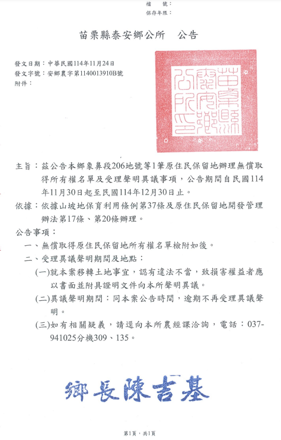 檢送苗栗縣泰安鄉公所本所辦理鄉象鼻段206地號等1筆原住民保留地無償取得所有權公告1份,敬請各單位惠予協助張貼公告