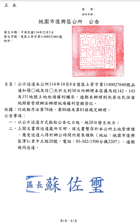 檢送桃園市復興區公所辦理本區羅馬段142、143及151地號國有土地他項權利塗銷,檢送公示送達公告1份