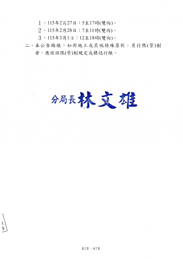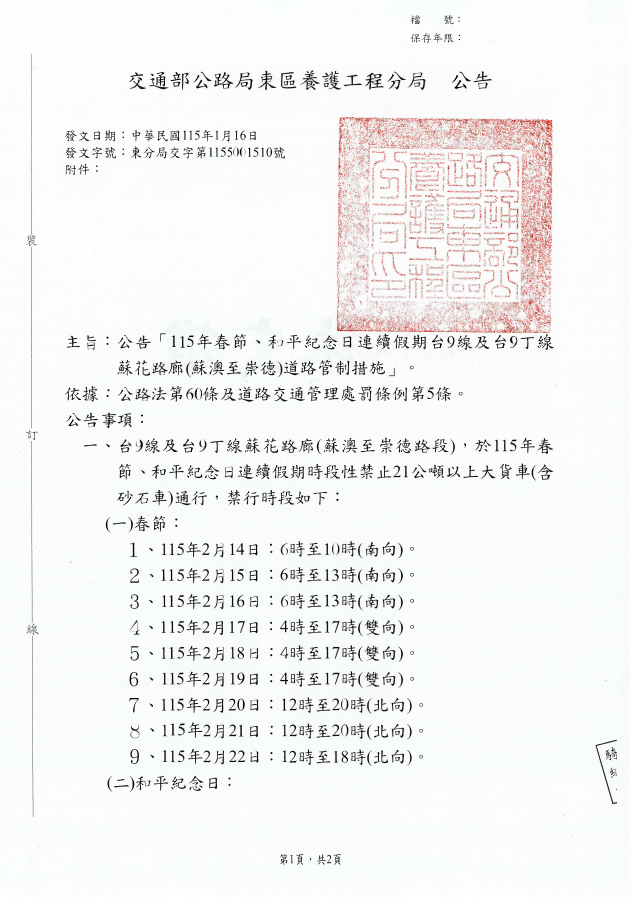 [ 轉知 ] 交通部公路局東區養護工程分局公告「115年春節、和平紀念日連續假期台9線及台9丁線蘇花路廊(蘇澳至崇德)道路管制措施」
