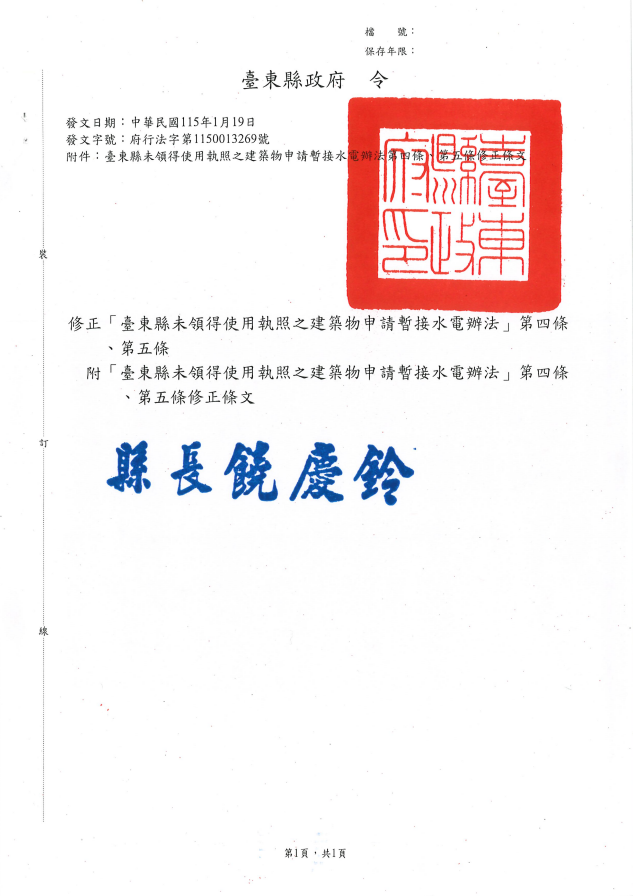 檢送 臺東縣政府115年1月19日府行法字第1150013269號令及其附件(臺東縣未領得使用執照之建築物申請暫接水電辦法第四條、第五條修正條文)