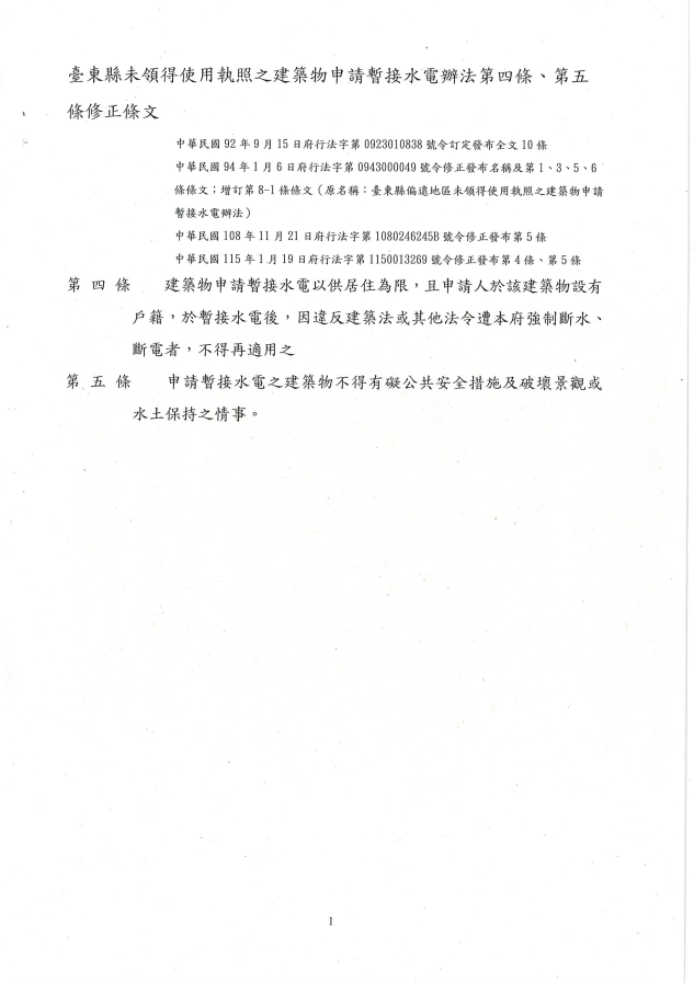 臺東縣政府115年1月19日府行法字第1150013269號令及其附件(臺東縣未領得使用執照之建築物申請暫接水電辦法第四條、第五條修正條文)