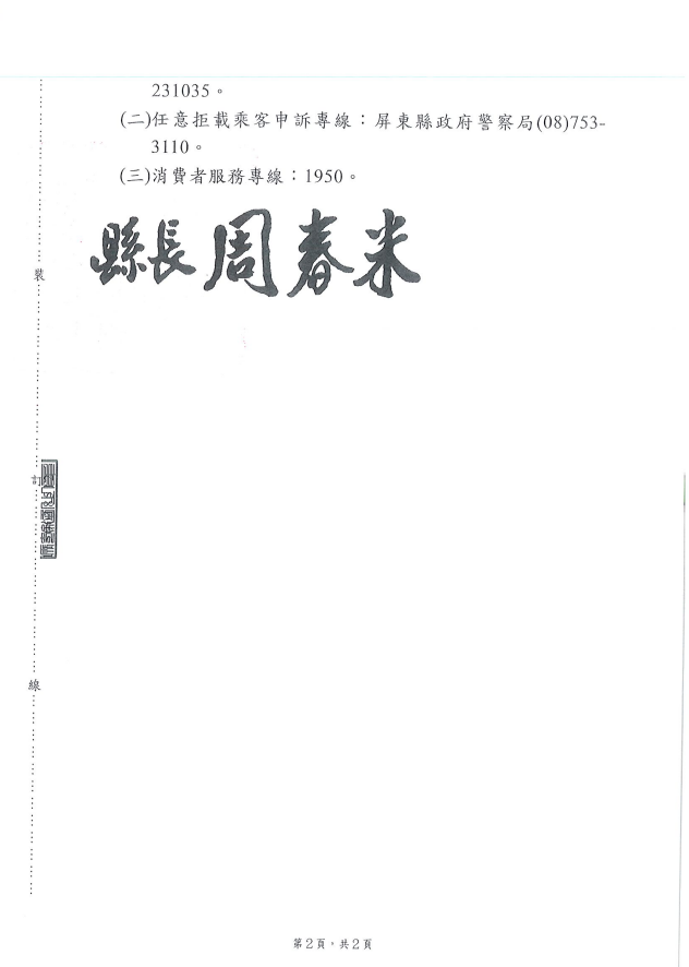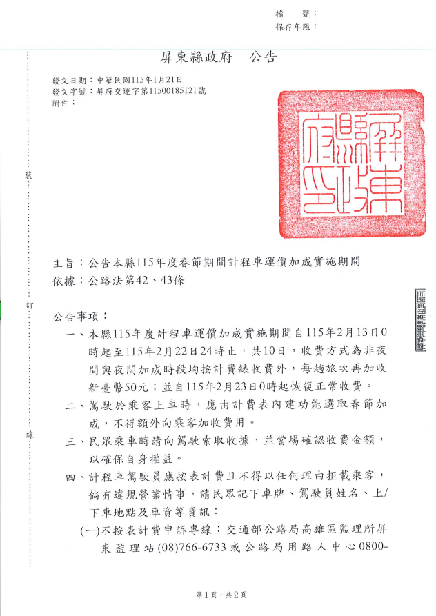 函轉 屏東縣政府115年度春節期間計程車運價加成實施期間公告