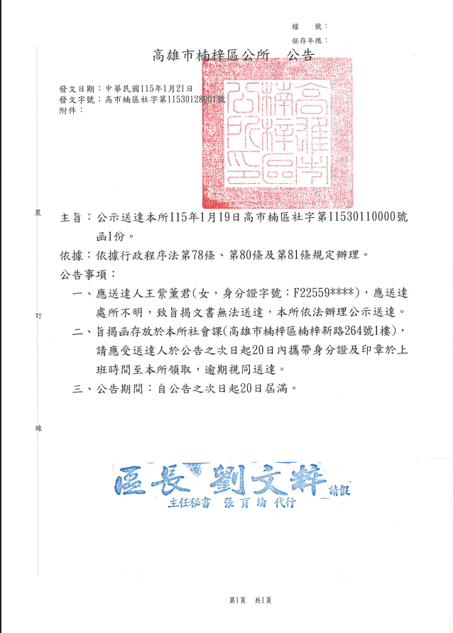 高雄市楠梓區公所特殊境遇家庭扶助案公告