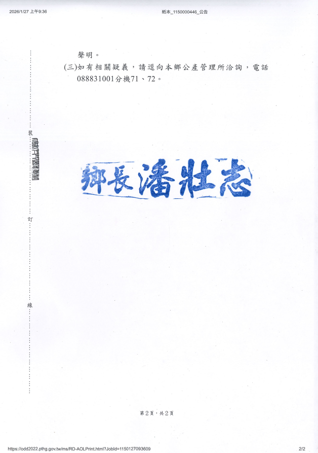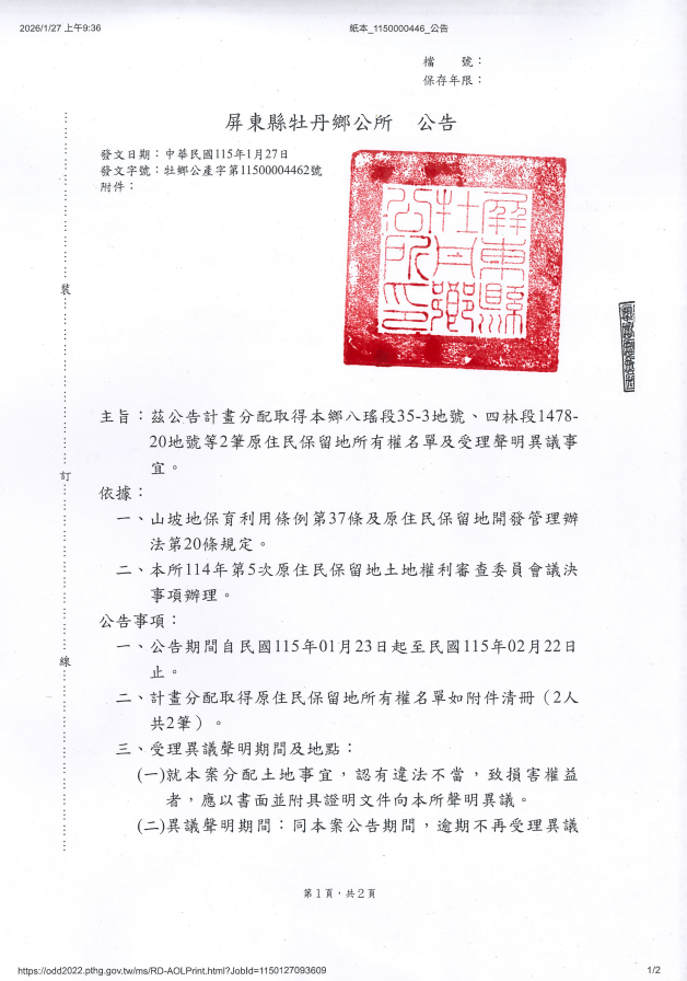 檢送 屏東縣牡丹鄉公八瑤段35-3地號、四林段1478-20地號等2筆原住民保留地無償取得所有權公告1份
