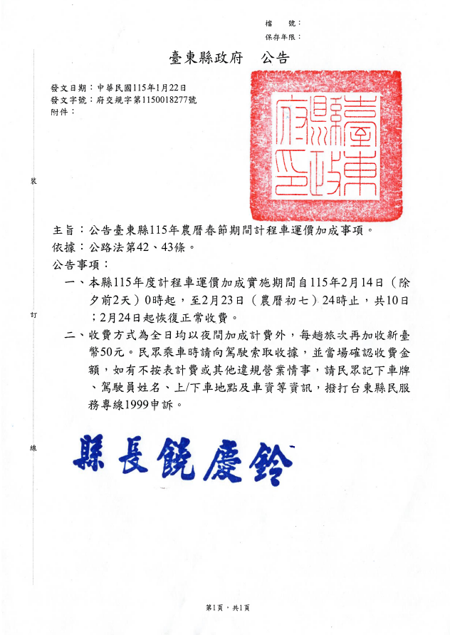 • /檢送 臺東縣115年度春節期間計程車運價加成實施期間公告1 份