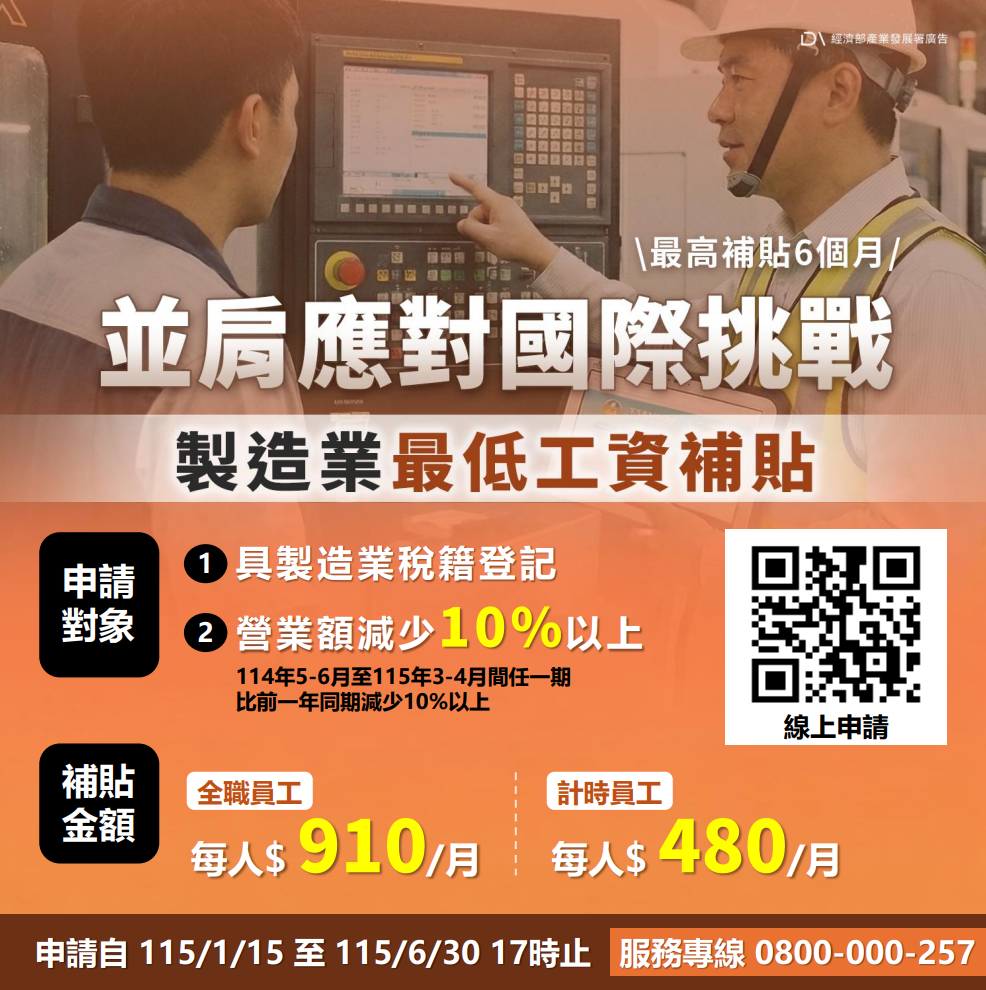 函轉 經濟部產業發展署受勞動部委託訂定之「受國際情勢及關稅衝擊影響製造業最低工資補貼作業要點」及補貼措施懶人包公告