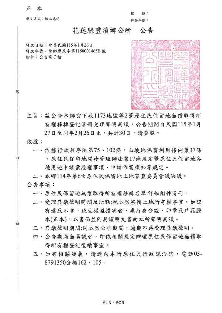 檢送 花蓮縣豐濱鄉公宮下段1173地號等2筆原住民保留地無償取得所有權移轉登記清冊一案公告