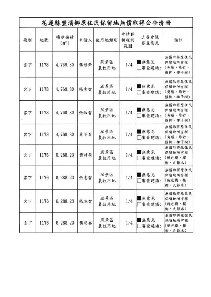 花蓮縣豐濱鄉公宮下段1173地號等2筆原住民保留地無償取得所有權移轉登記清冊一案公告