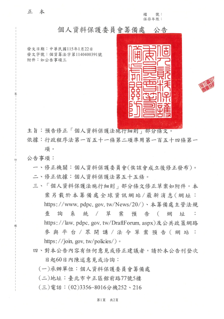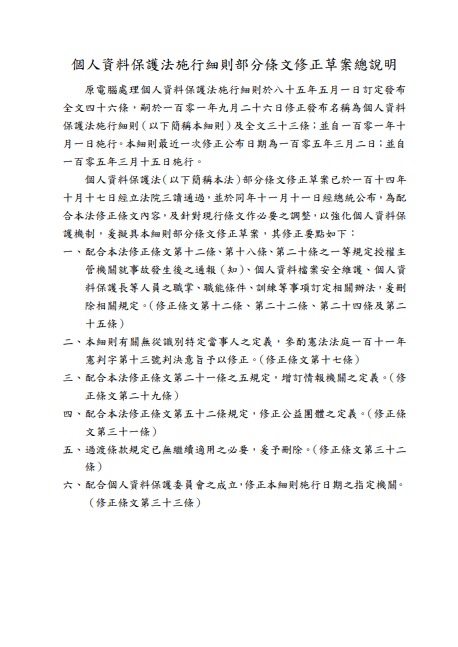函轉 臺東縣政府「個人資料保護法施行細則」部分條文修正草案預告公告