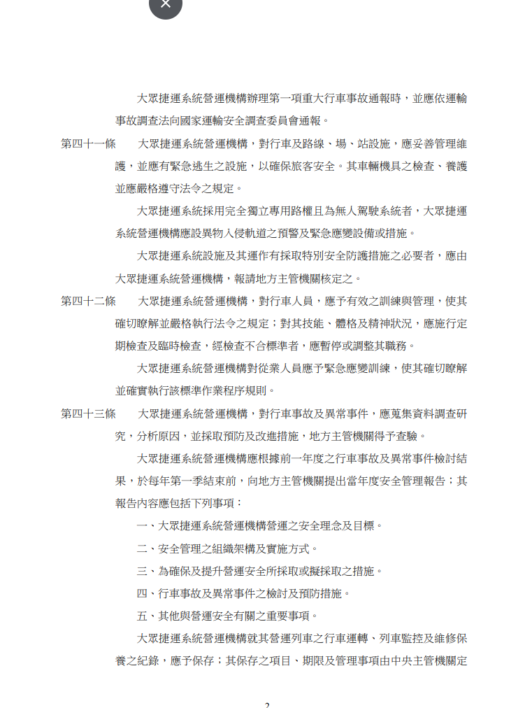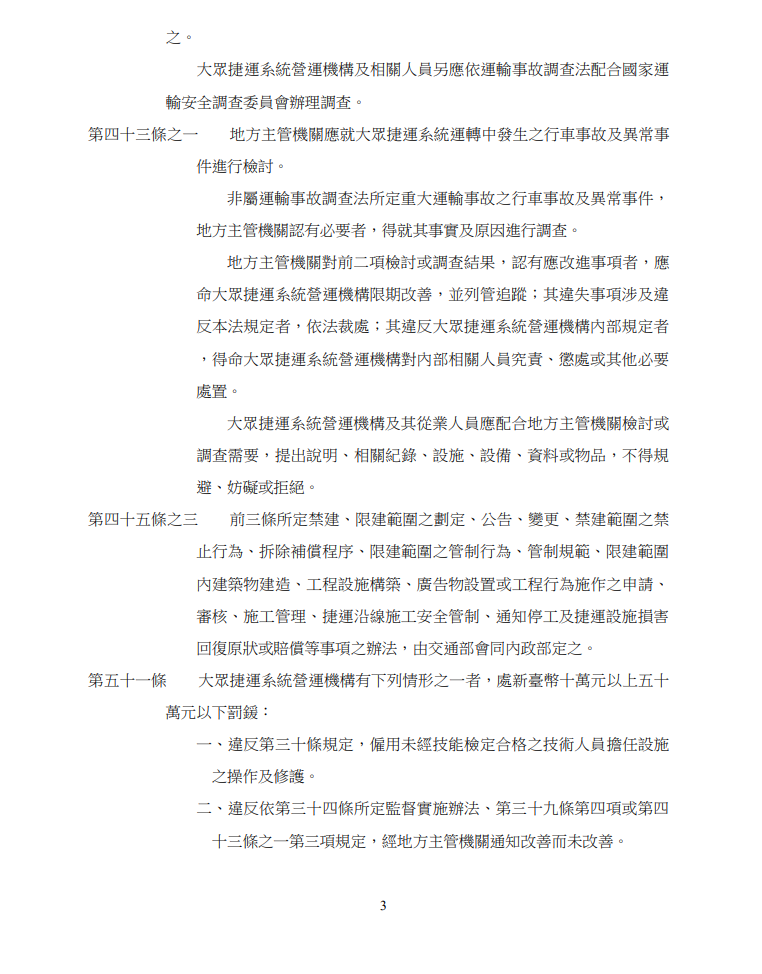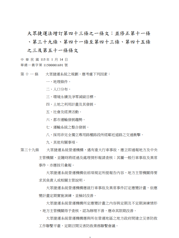 函轉 交通部公布修正之大眾捷運法部分條文
