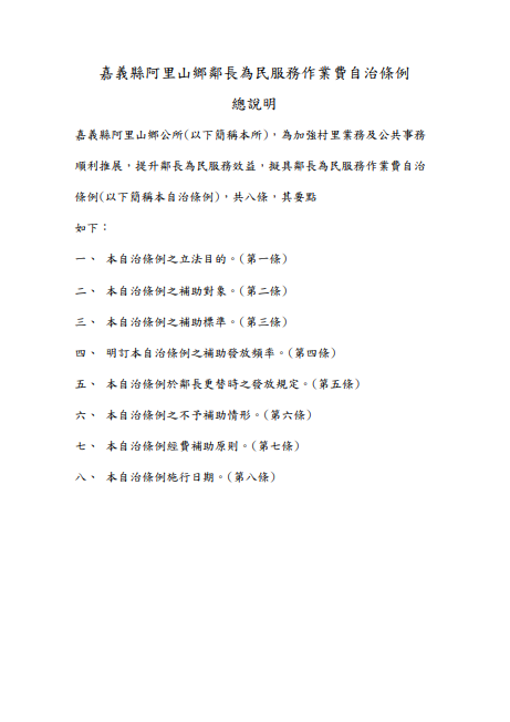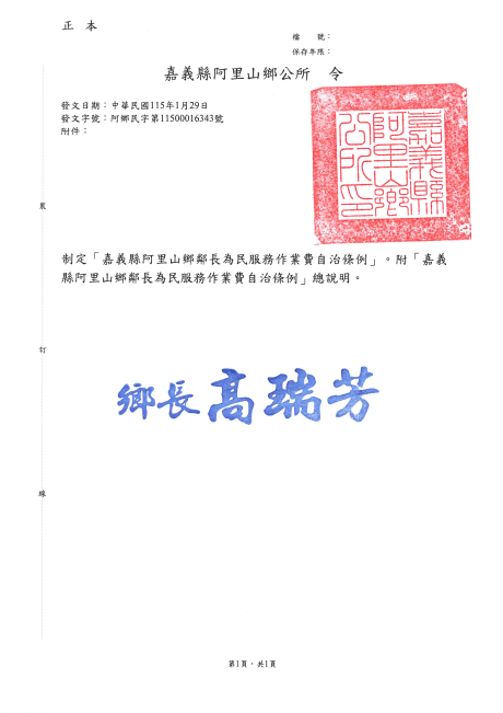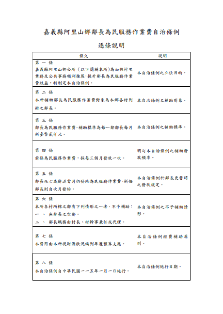 嘉義縣阿里山鄉公所訂定「嘉義縣阿里山鄉鄰長為民服務作業費自治條例」訂定公告