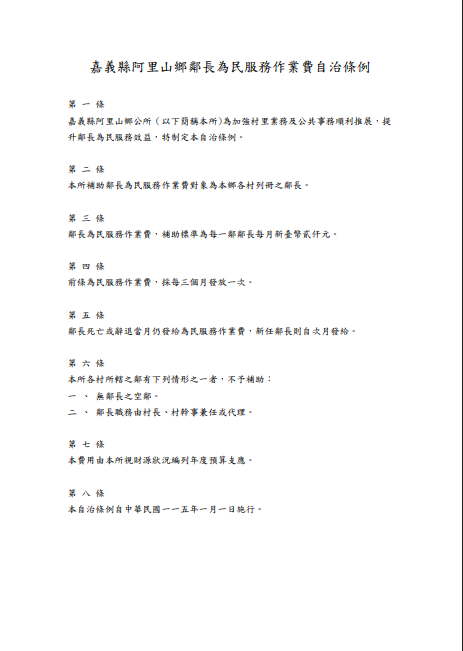 檢送 嘉義縣阿里山鄉公所訂定「嘉義縣阿里山鄉鄰長為民服務作業費自治條例」訂定公告