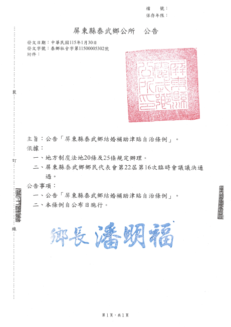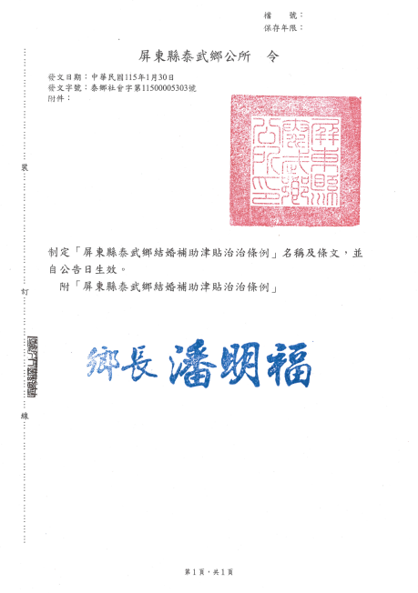檢送 屏東縣泰武鄉公所「屏東縣泰武鄉結婚補助津貼自治條例」公告