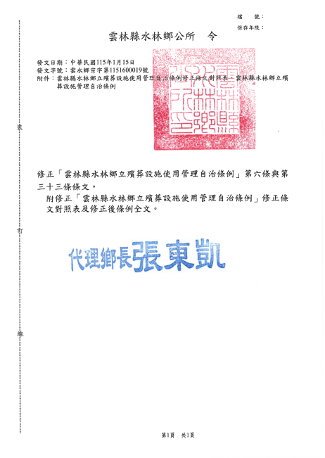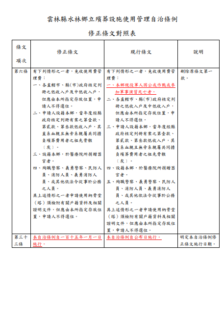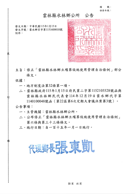 雲林縣水林鄉修正「雲林縣水林鄉立殯葬設施使用管理自治條例」修正部分條文