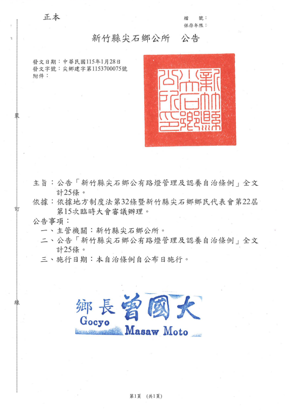 檢送 更正新竹縣尖石鄉公所制定「新竹縣尖石鄉公有路燈管理及認養自治條例」之公告