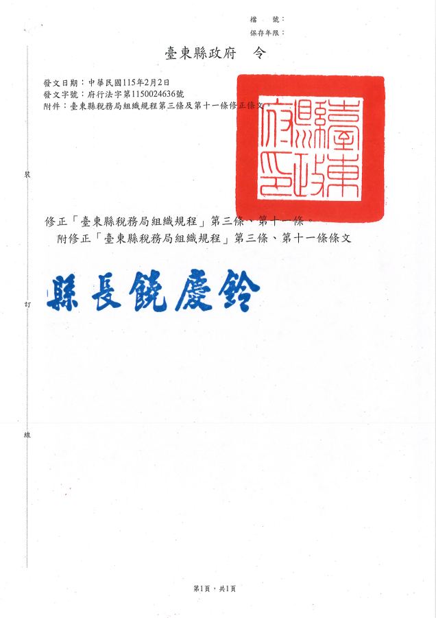 • /檢送 臺東縣政府115年2月2日府行法字第1150024636號令及其附件