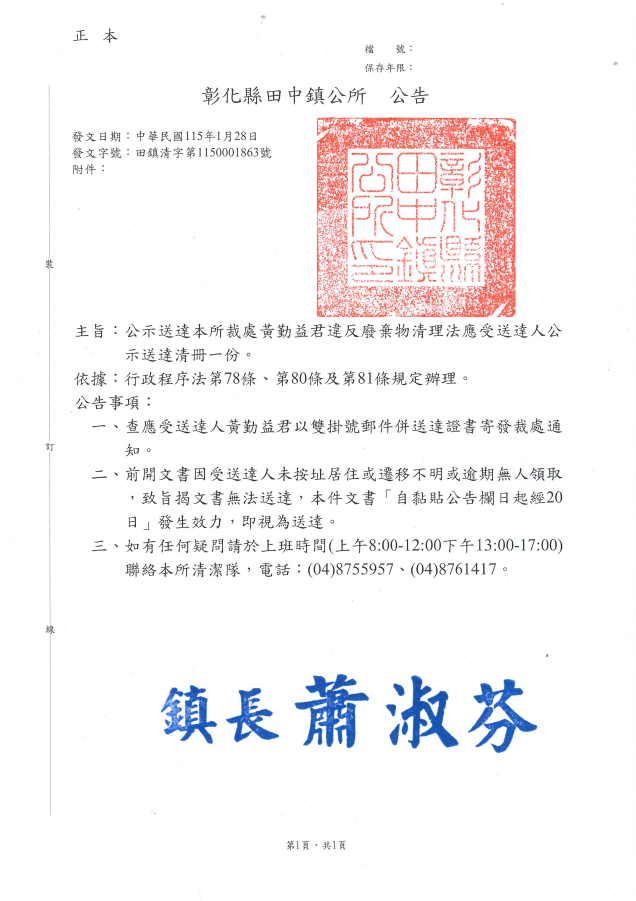 檢送 彰化縣田中鎮公所辦理違反廢棄物清理法公示送達公告