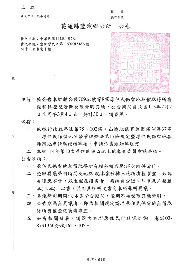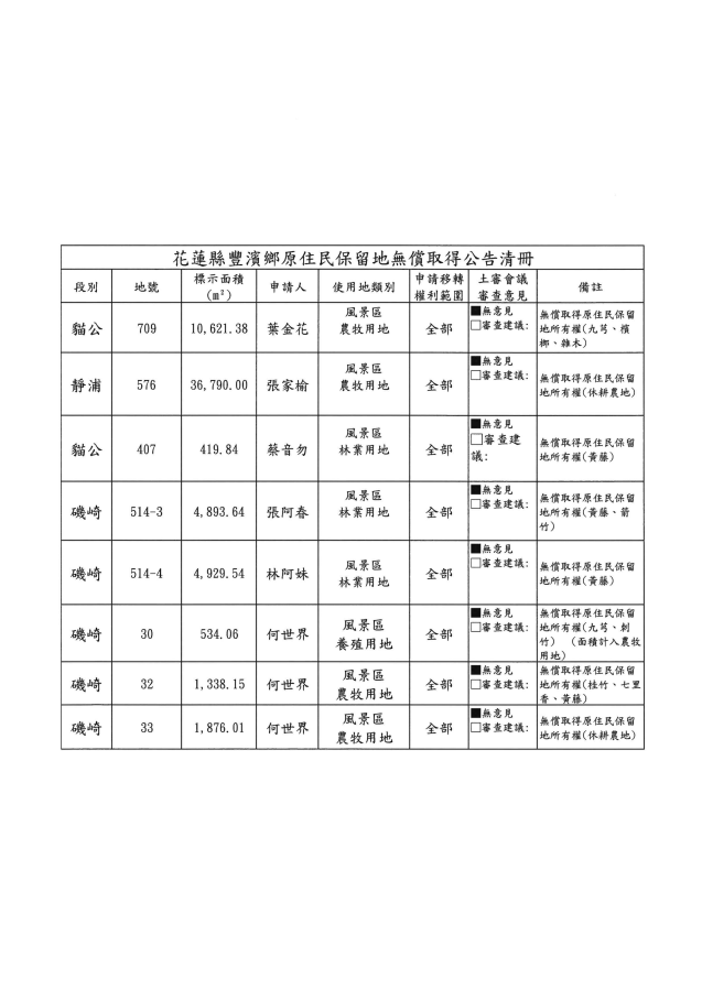 檢送 花蓮縣豐濱鄉公所貓公段709地號等8筆原住民保留地無償取得所有權移轉登記清冊一案公告