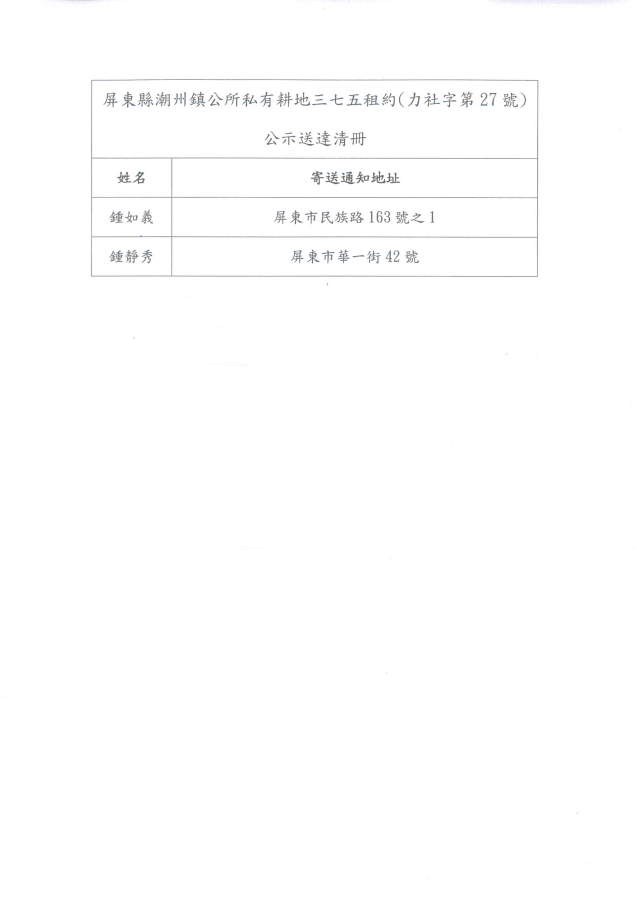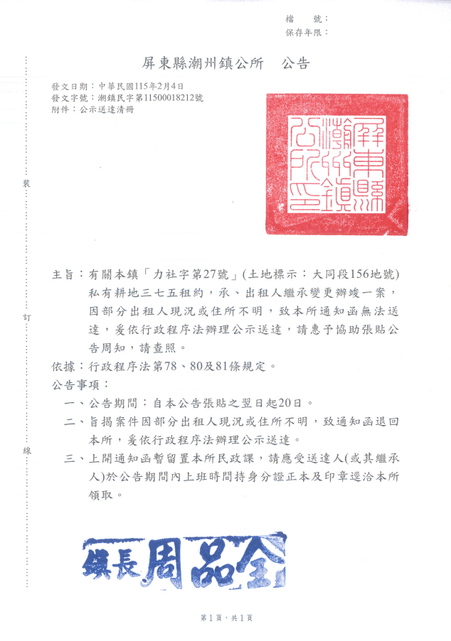 有關屏東縣潮州鎮公所 「力社字第27號」(土地標示:大同段156地號)私有耕地三七五租約,承、出租人繼承變更辦竣一案公告