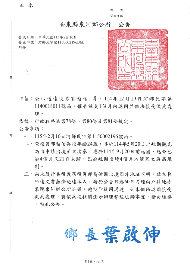 檢送臺東縣東河鄉公所 更正後本鄉91年次役男郭裔佑催告1個月內返國依法接受徵兵處理公示送達公告