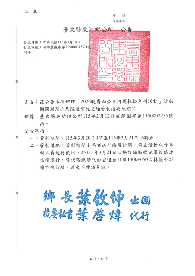 「2026晚崙西亞東河馬拉松系列活動」活動期間封閉小馬隧道實施交通管制公告一份