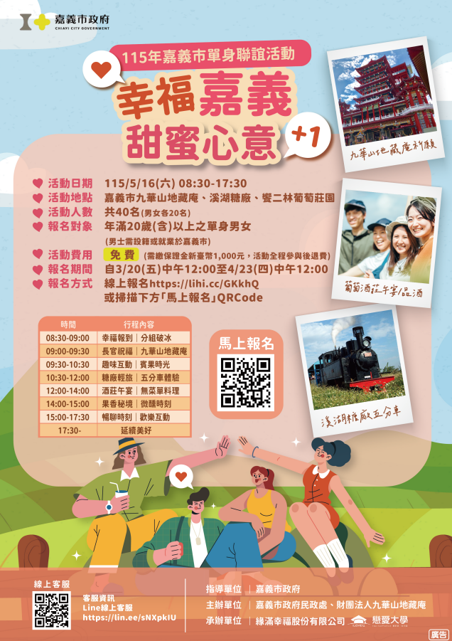 嘉義市政府與財團法人九華山地藏庵訂於115年5月16日聯合舉辦115年「幸福嘉義・甜蜜心意+1」單身聯誼活動