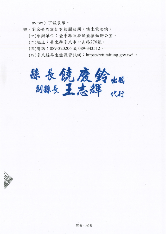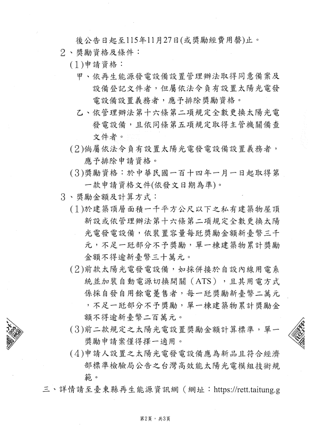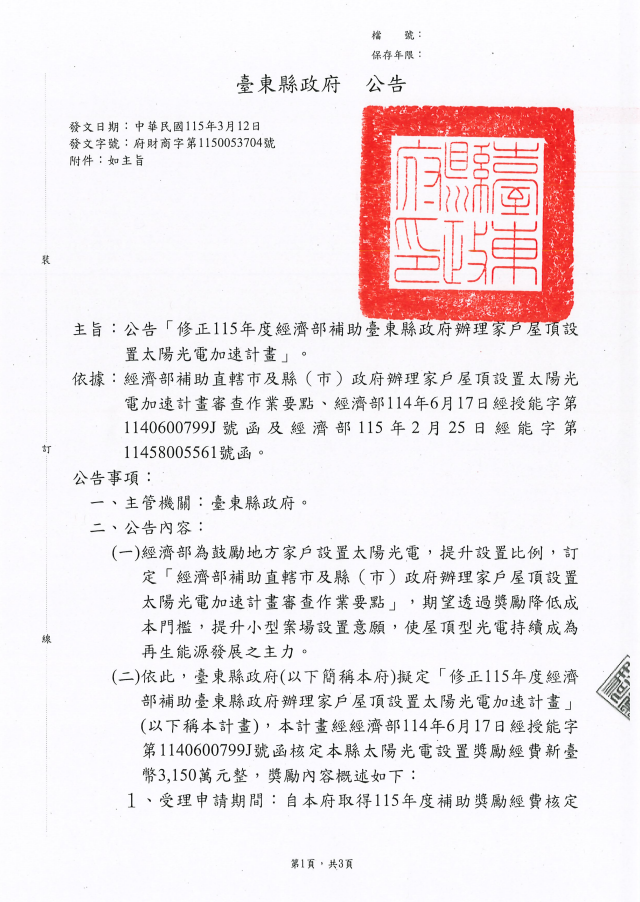 檢送「修正115年度經濟部補助臺東縣政府辦理家戶屋頂設置太陽光電加速計畫」公告