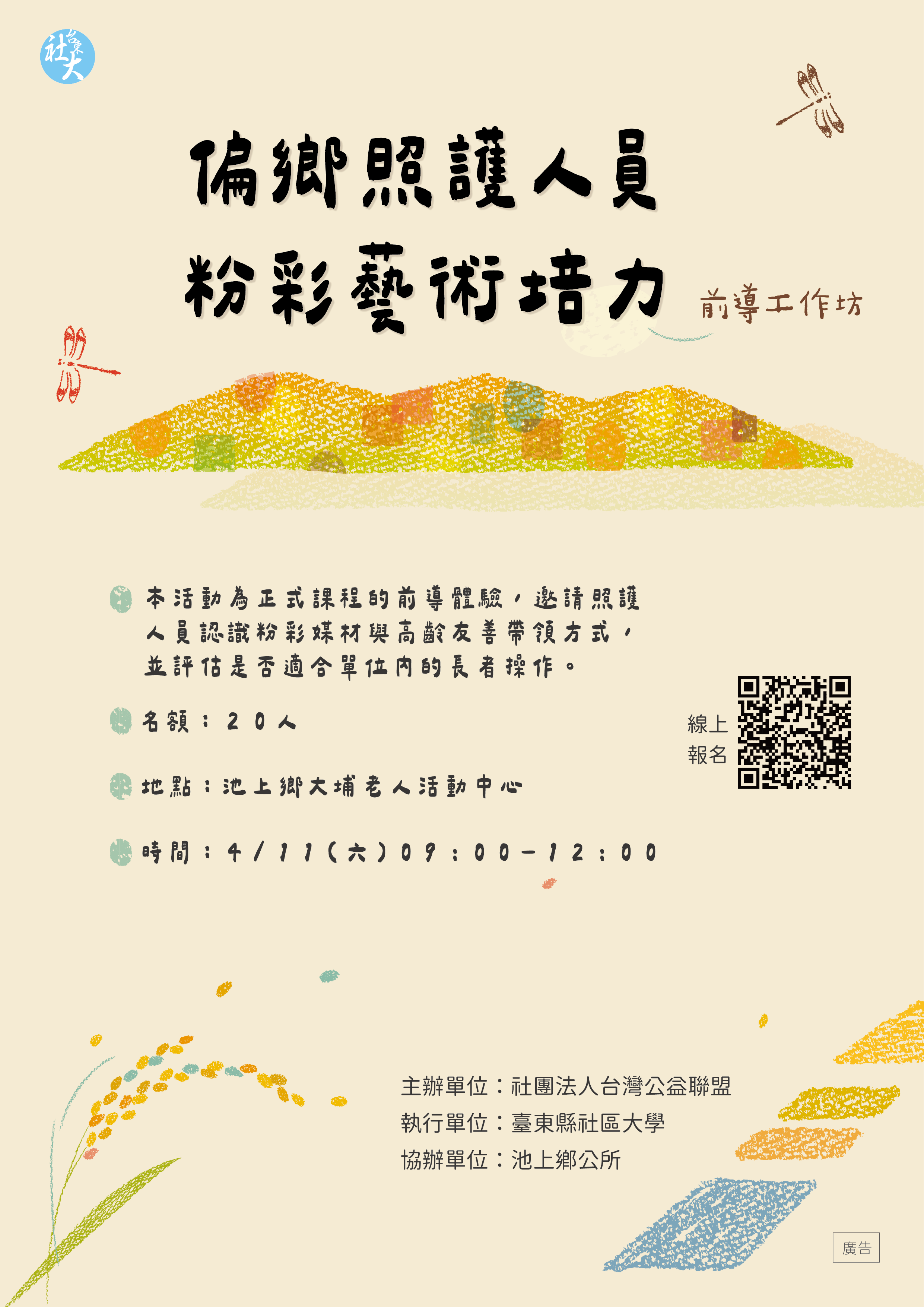 檢送臺東縣社區大學辦理「偏鄉照護人員粉彩藝術培力」前導工作坊