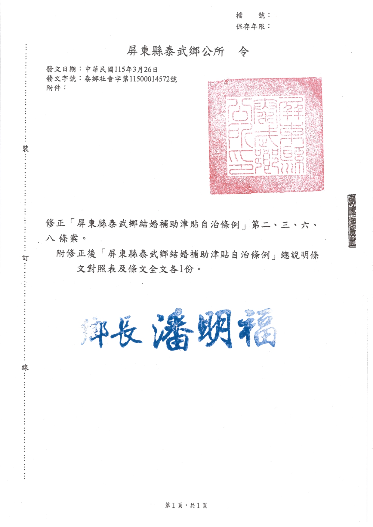 「屏東縣泰武鄉結婚補助津貼自治條例」公告、令、修正條文對照表及修正後條文全文各1份