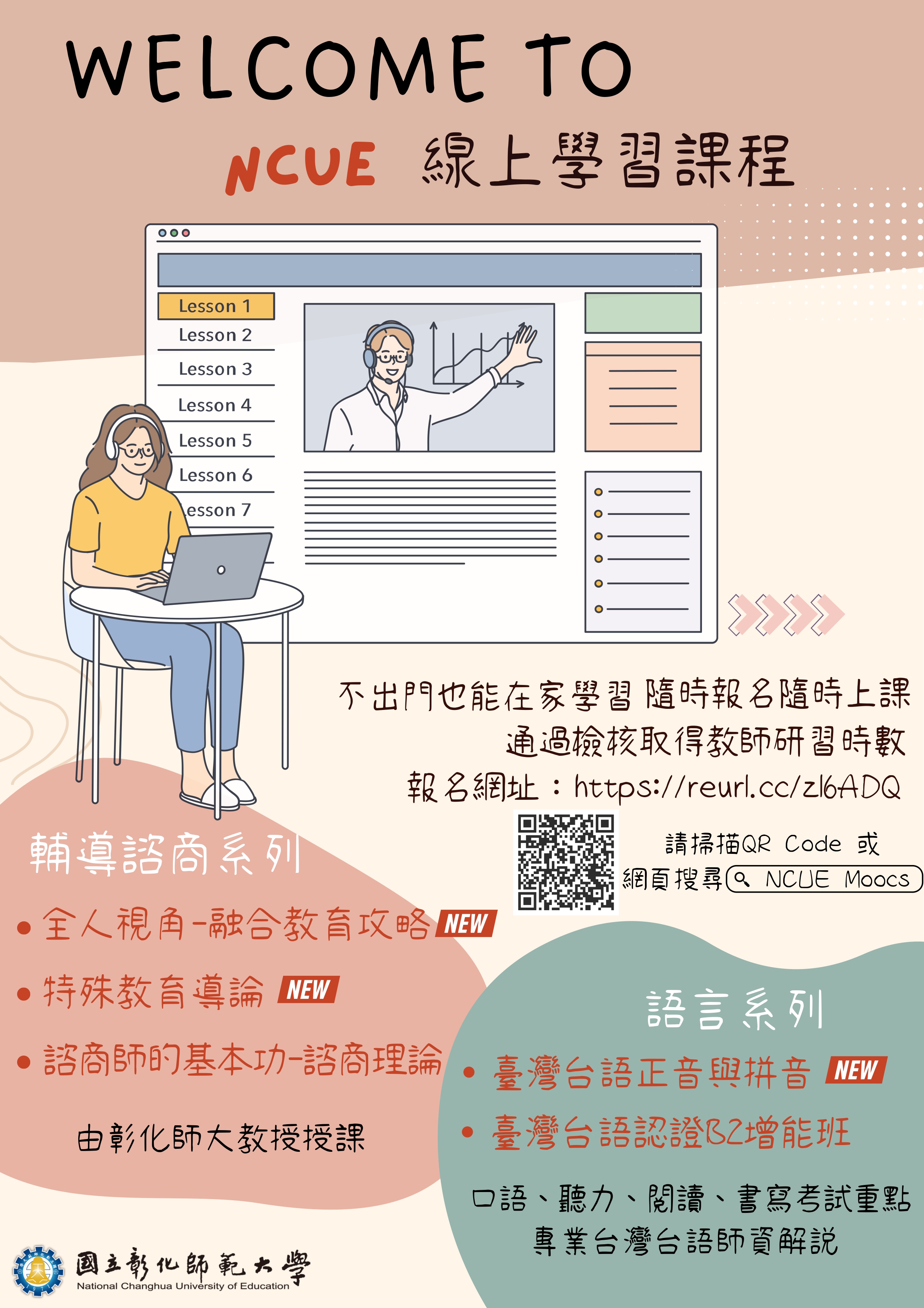 檢送 國立彰化師範大學 推廣教育「精緻Moocs系列課程」之「全人視角-融合教育攻略」、「特殊教育概論」、「諮商師的基本功-諮商理論」、「臺灣台語正音與拼音」、「臺灣台語認證B2增能班」等數位課程招生宣傳DM 上一篇 下一篇
