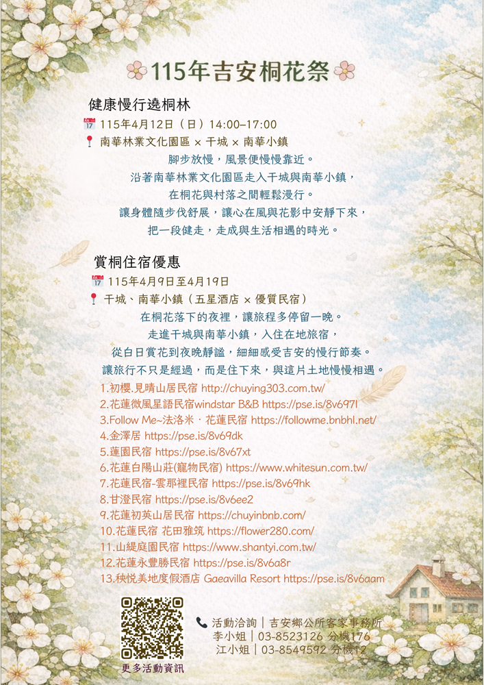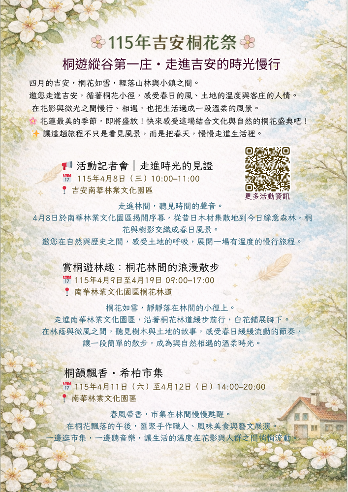 花蓮縣吉安鄉公所 辦理「2026吉安桐花祭-桐遊縱谷第一庄・走進吉安的時光慢行」活動