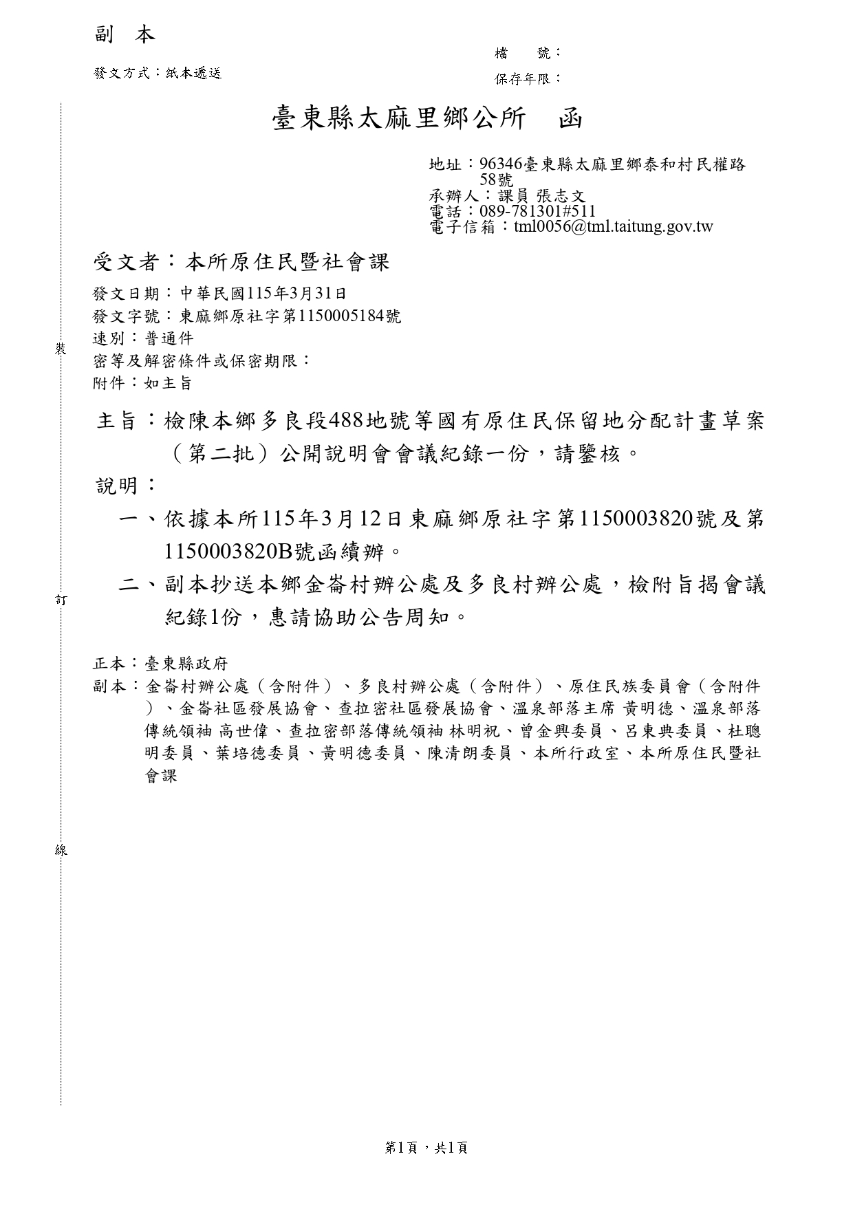 臺東縣太麻里鄉多良段488地號等國有原住民保留地分配計畫草案(第二批)公開說明會會議紀錄 Attachments: 臺東縣太麻里鄉多良段488地號等國有原住民保留地分配計畫草案(第二批)公開說明會會議紀錄[ ]175 kB 上一篇 下一篇