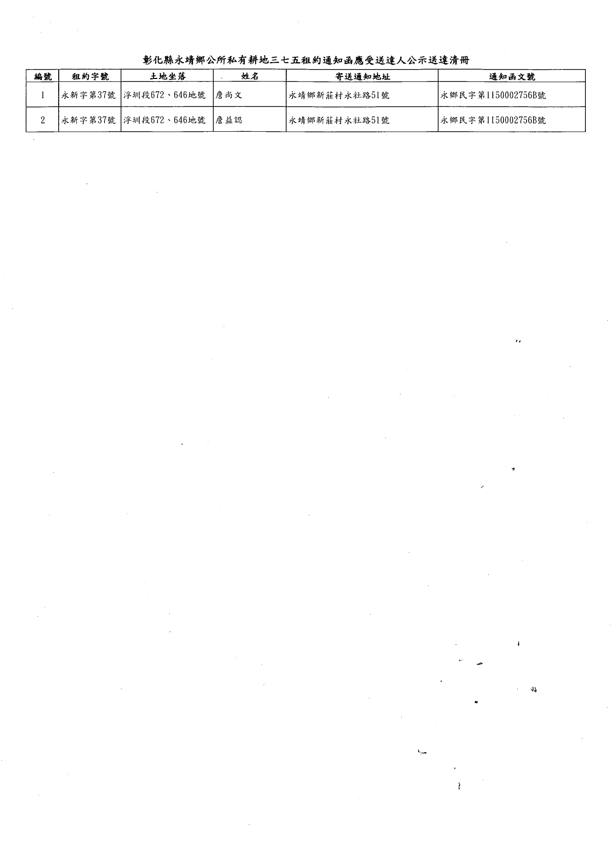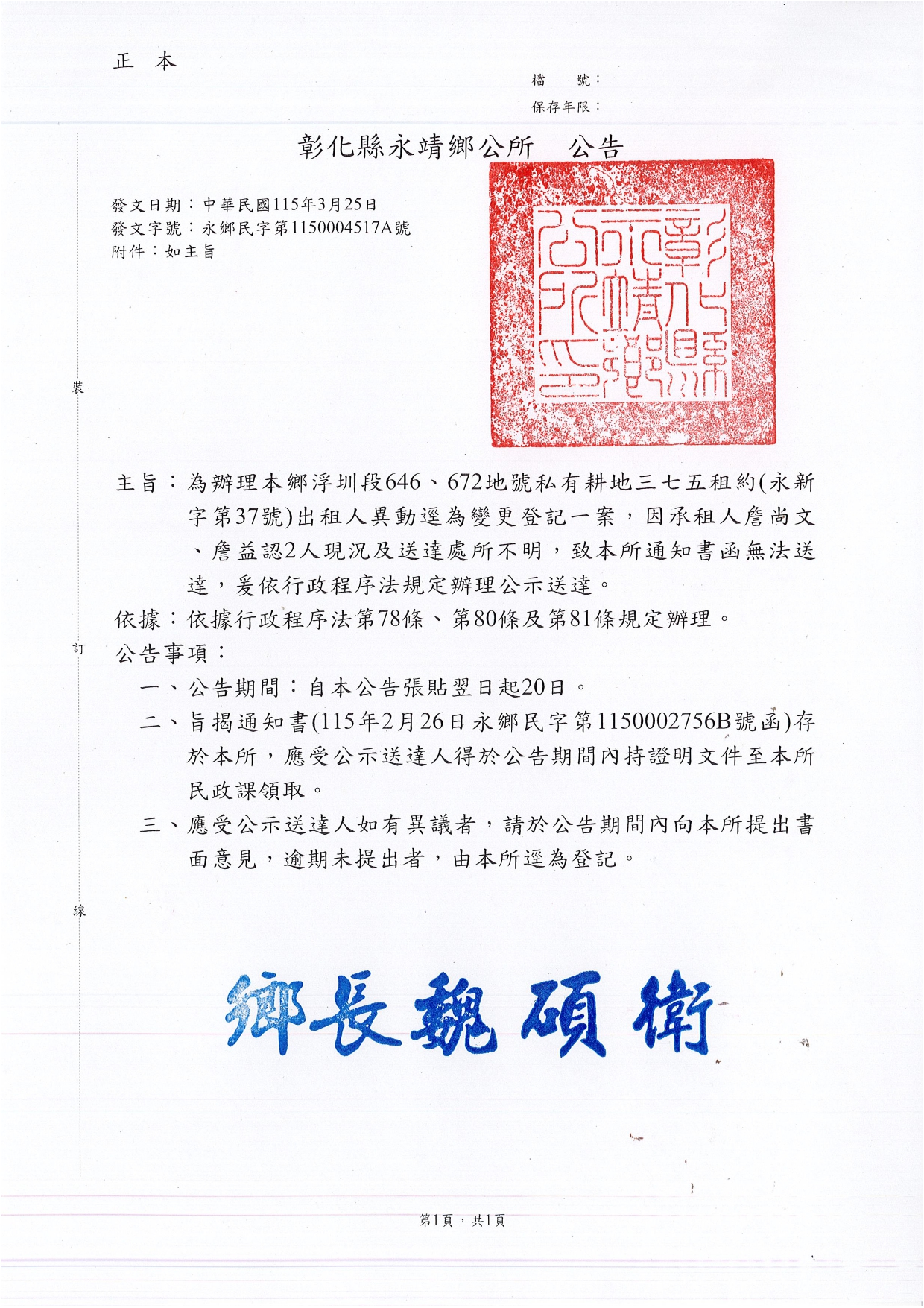 有關 彰化縣永靖鄉公所 浮圳段646、672地號私有耕地三七五租約「永新字第37號」出租人異動逕為變更登記一案,因承租人現況或送達處所不明,致本所租約變更登記通知函遭退回無法送達,爰依法辦理公示送達
