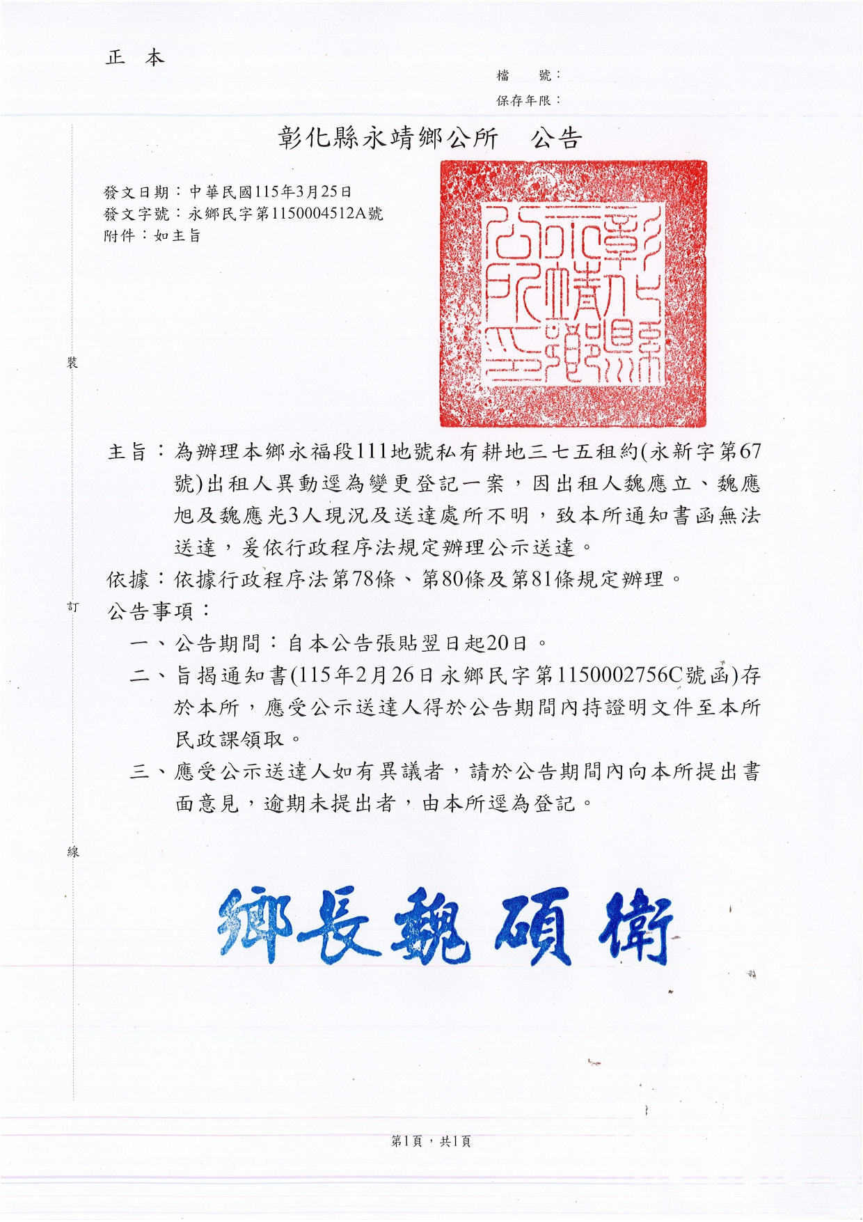 有關 彰化縣永靖鄉公所 永福段111地號私有耕地三七五租約「永新字第67號」出租人異動逕為變更登記一案,因部分出租人現況或送達處所不明,致本所租約變更登記通知函遭退回無法送達,爰依法辦理公示送達 上一篇 下一篇