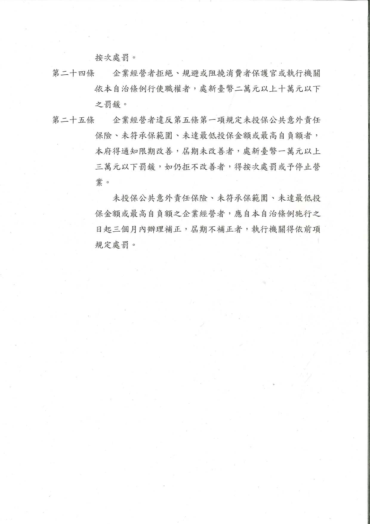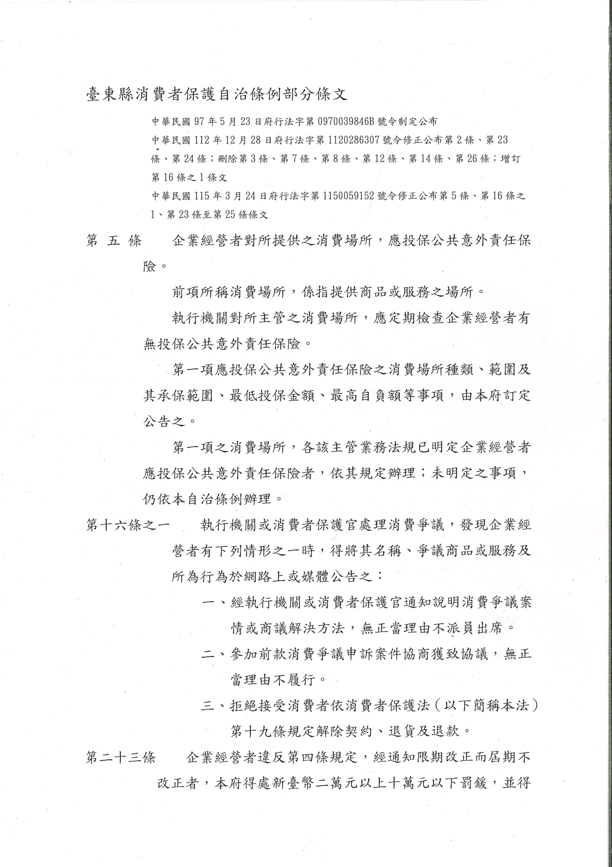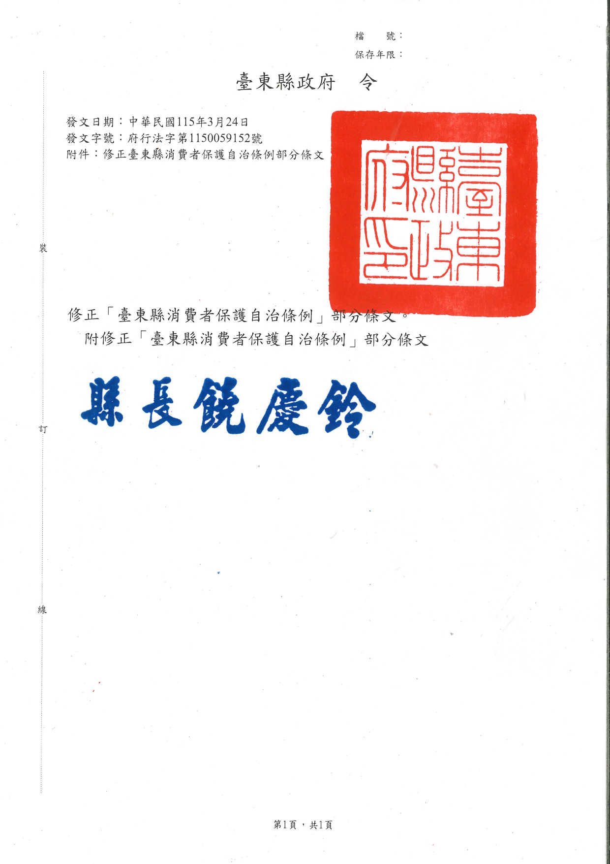 115年3月24日府行法字第1150059152號令及其附件(修正臺東縣消費者保護自治條例部分條文)各1份