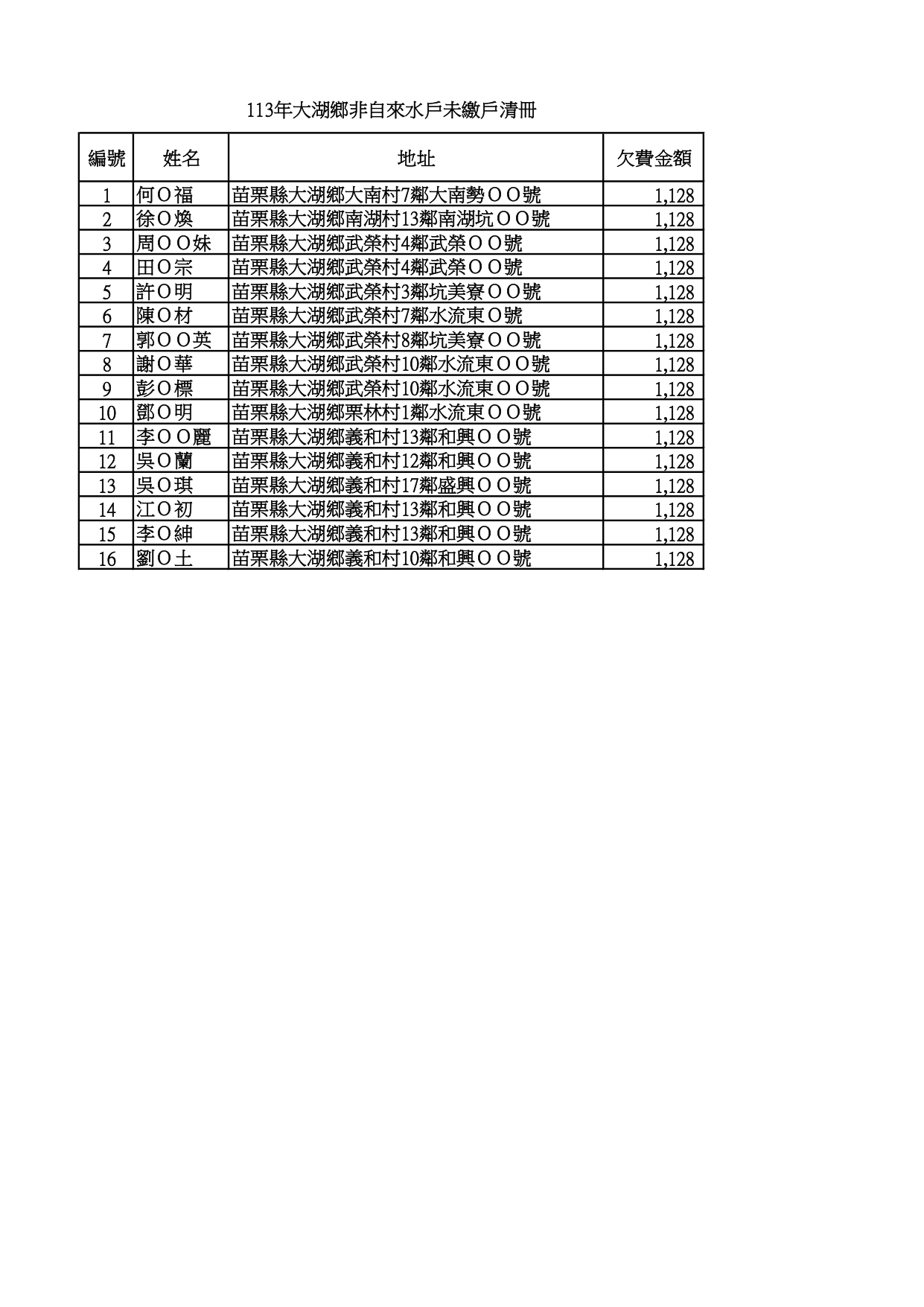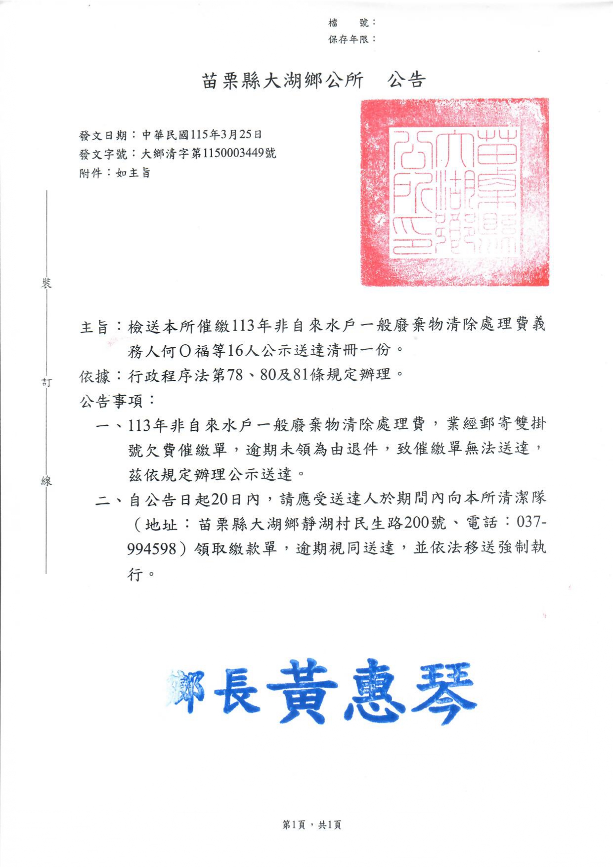 檢送 苗栗縣大湖鄉公所 辦理催繳113年度非自來水用戶一般廢棄物清除處理費公示送達及清冊各1份