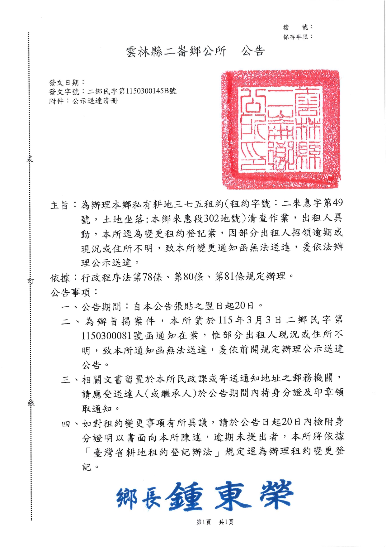 雲林縣二崙鄉公所 辦理私有耕地三七五租約(租約字號:二來惠字第49號,土地坐落:來惠段302地號)清查作業,出租人異動,本所逕為變更租約登記案,因部分出租人招領逾期或現況或住所不明,致本所變更通知函無法送達,爰依法辦理公示送達