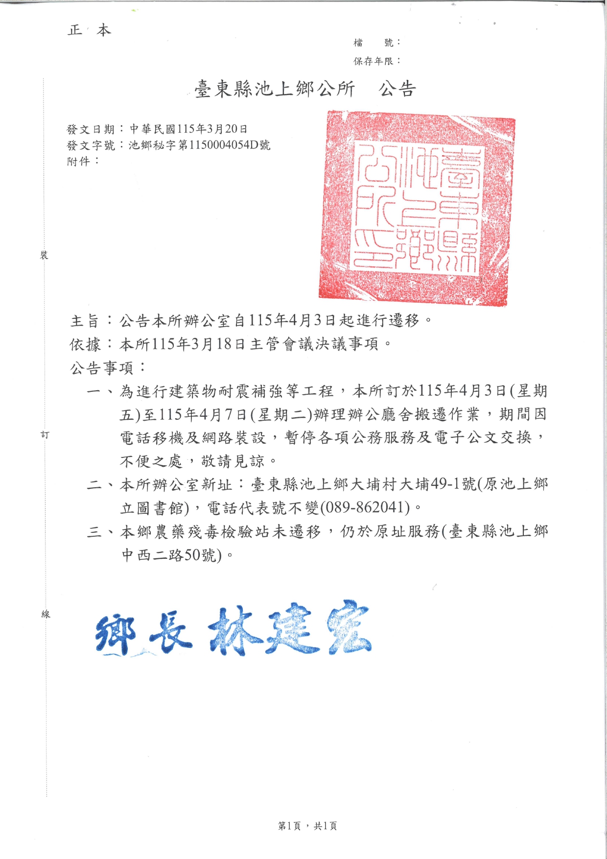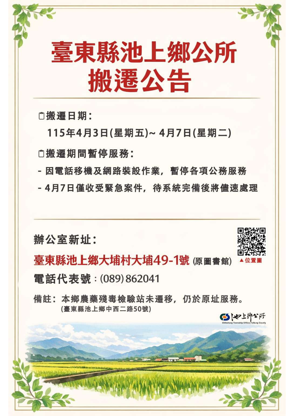 轉知 臺東縣池上鄉公所 為進行建築耐震補強工程,訂於訂於115年4月3日(星期五)至115年4月7日(星期二)辦理辦公廳舍搬遷作業