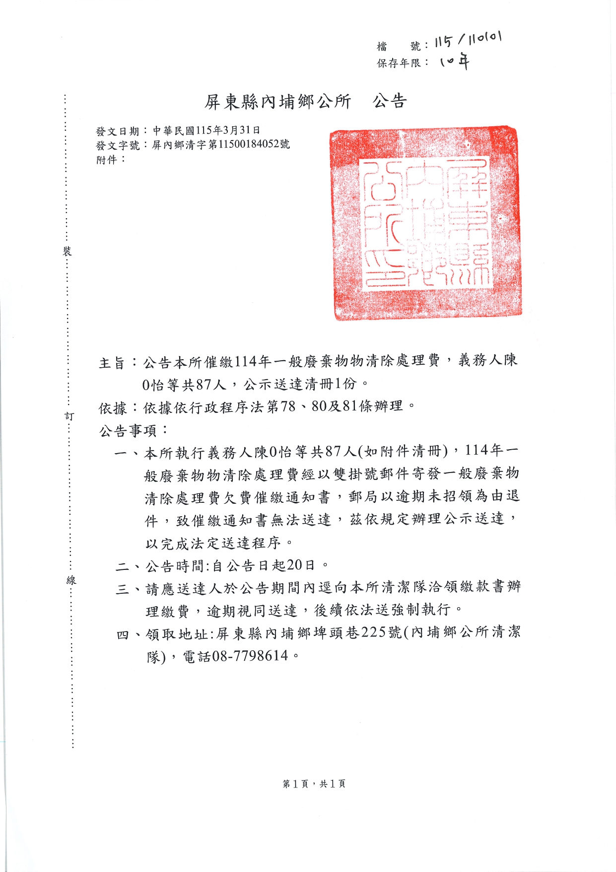 檢送屏東縣內埔鄉公所催繳114年一般廢棄物物清除處理費公示送達公告及送達清冊各1份