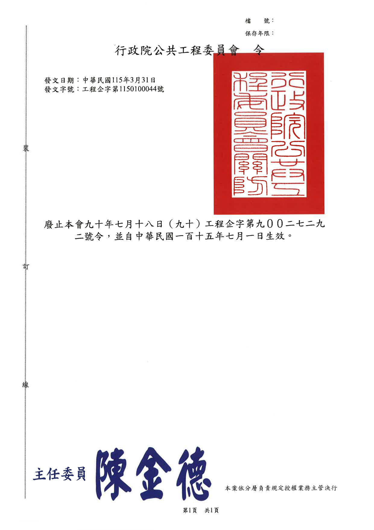 行政院公共工程委員會 90年7月18日(90)工程企字第90027292號令,業經本會於中華民國115年3月31日以工程企字第1150100044號令廢止,並自115年7月1日生效,檢附發布令影本1份 上一篇 下一篇