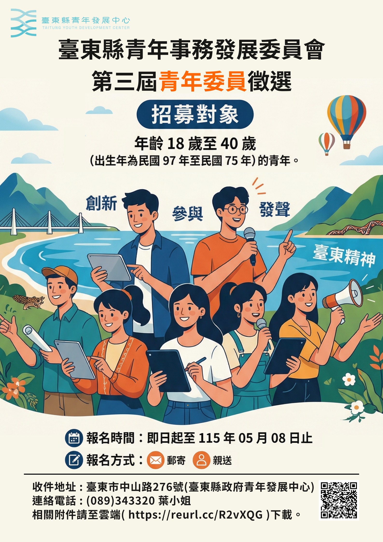 檢送「臺東縣青年事務發展委員會第三屆青年委員遴聘簡章」、委員推薦表、宣傳海報各1份
