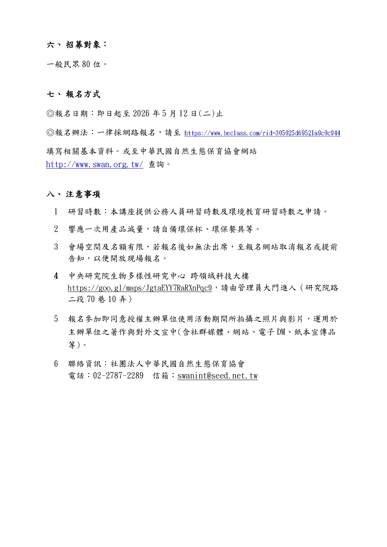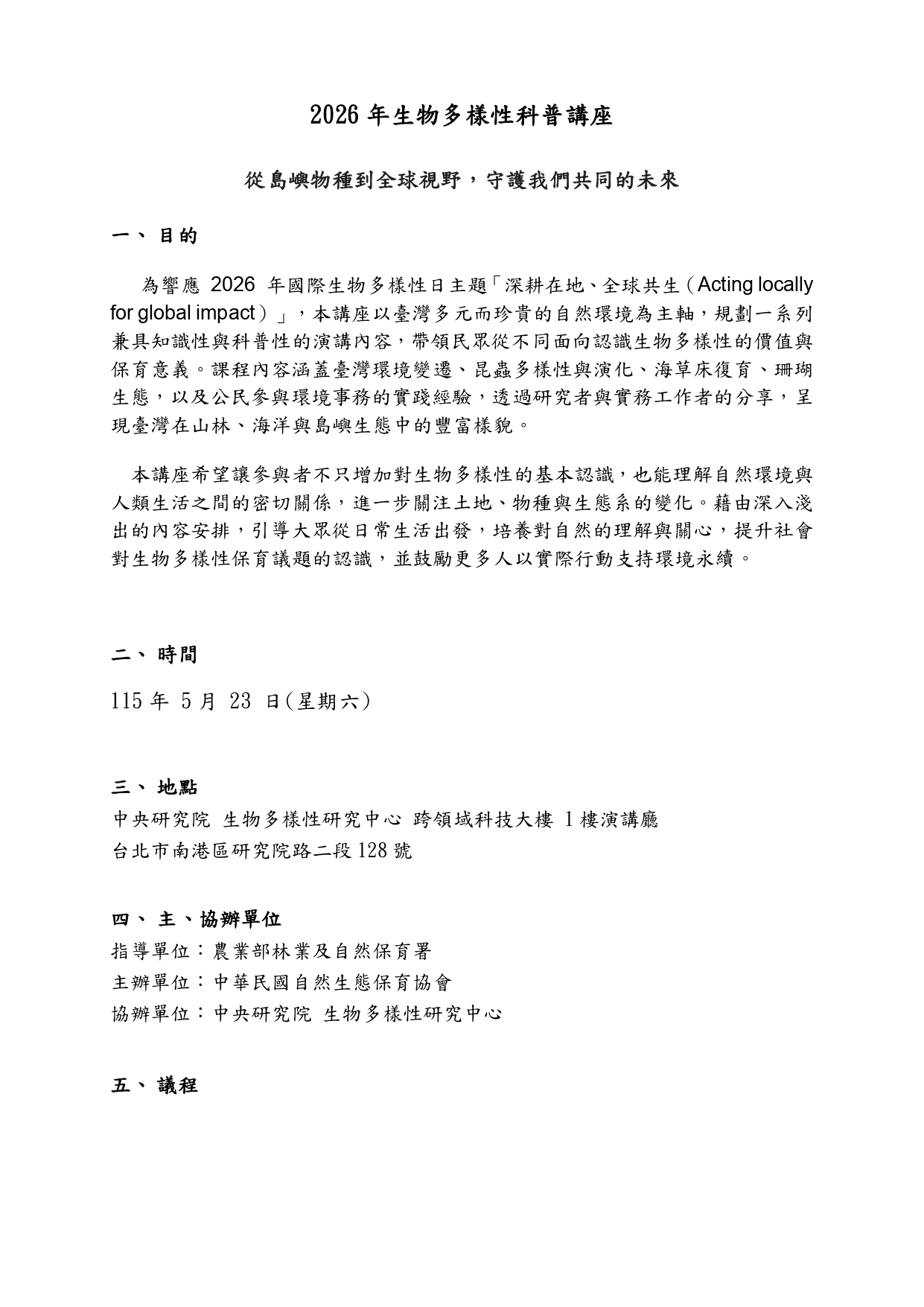 函轉農業部林業及自然保育署(下稱林保署)補助社團法人中華民國自然生態保育協會訂於115年5月23日(星期六)假中央研究院生物多樣性研究中心跨領域科技大樓1樓演講廳舉辦「2026生物多樣性科普講座」 上一篇 下一篇