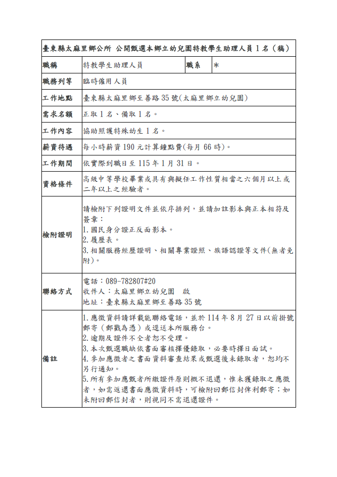 • 工作地點:臺東縣太麻里鄉金華路35號(太麻里鄉立幼兒園)
