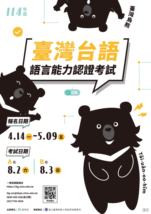 2.有關114年8月考試採「分卷分天」辦理,A卷訂於114年8月 2日(星期六)測驗,B卷訂於114年8月3日(星期日)舉 行,一人限報考一種卷別。報名時間自114年4月14日上午9 時起,至同年5月9日下午5時止,報名費為新臺幣250元, 19歲以下(含)免報名費,歡迎至考試官網 (https://ttg.moe.edu.tw)線上報名