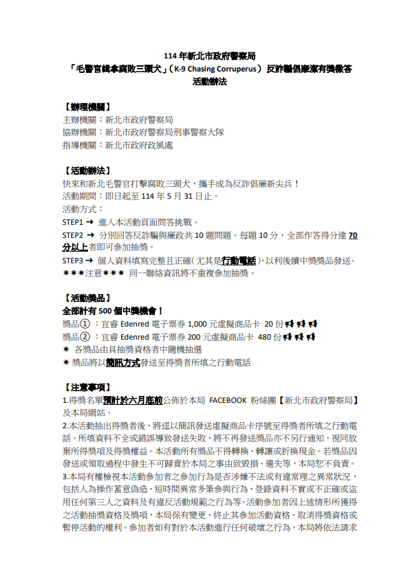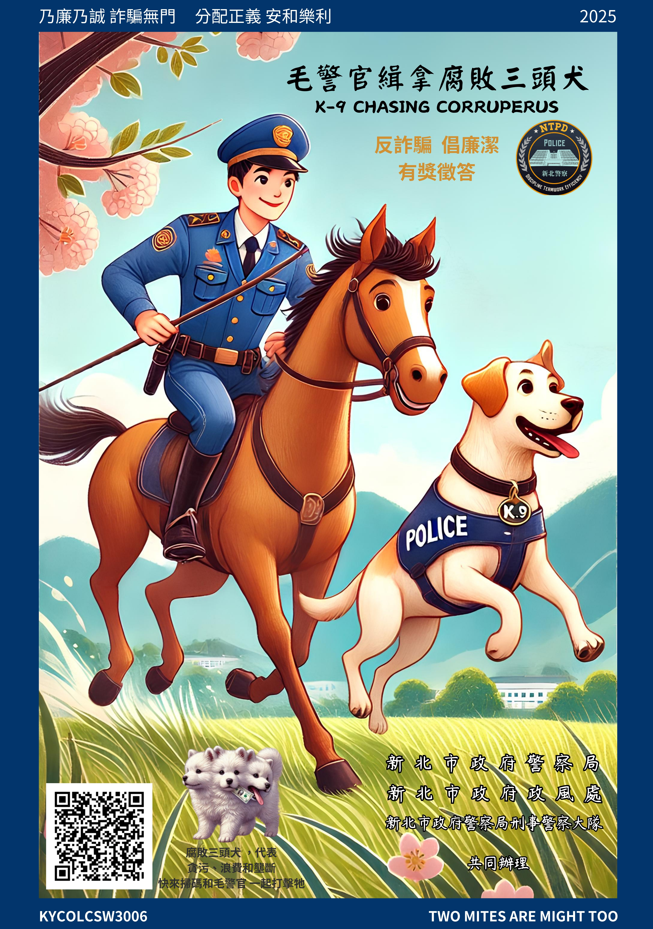 新北市政府警察局辦理「毛警官緝拿腐敗三頭犬(K-9 Chasing Corruperus) 反詐騙倡廉潔有獎徵答活動」